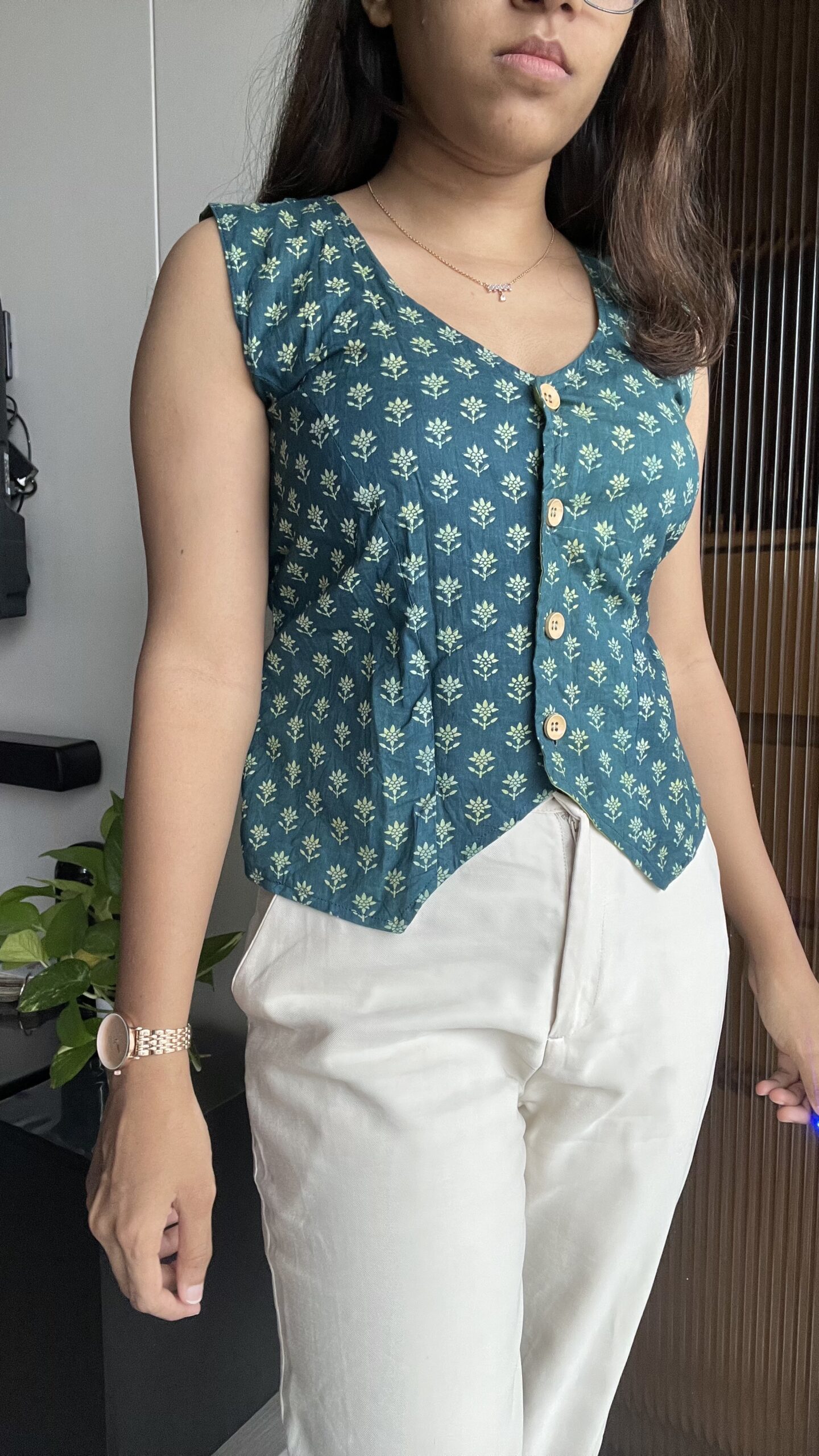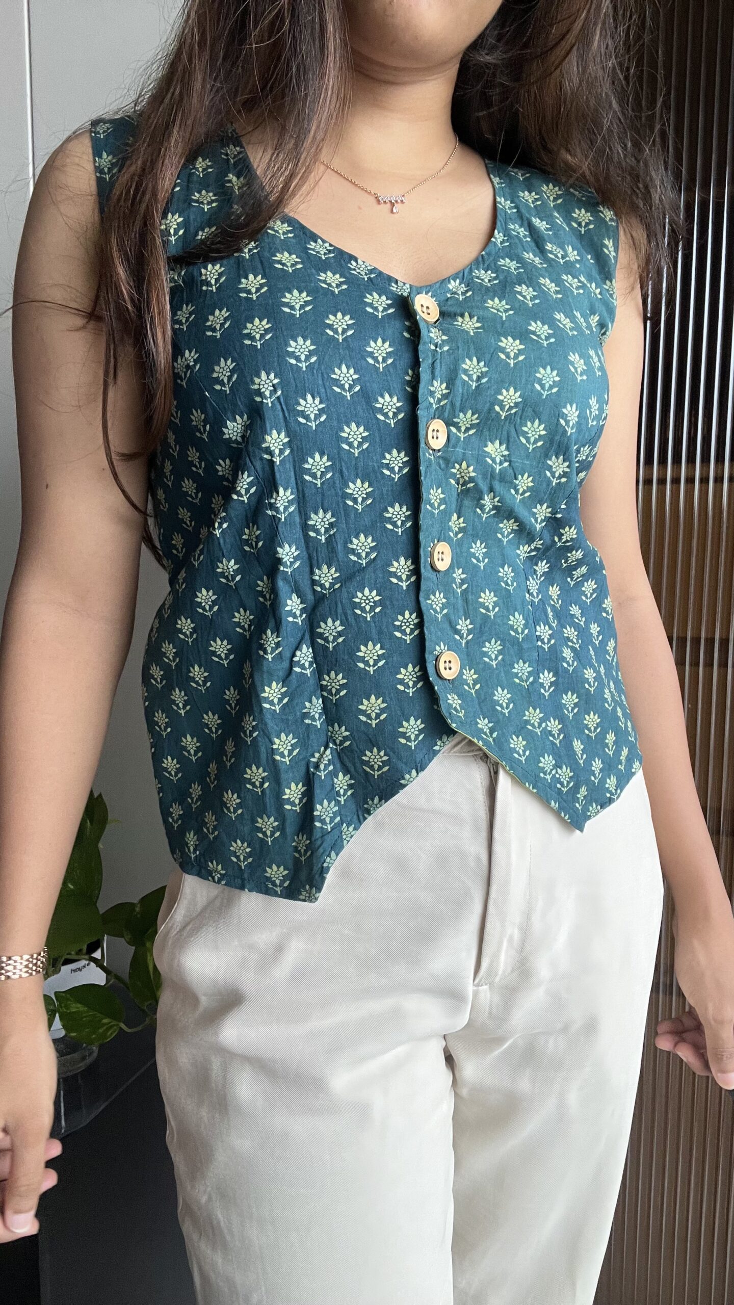 Elevate your wardrobe with this cotton waistcoat featuring a traditional print in Green. This waistcoat is easy to style and works well for both office and casual looks. Wear it with pants or a skirt for work, or pair it with jeans or shorts for a cool and relaxed style.